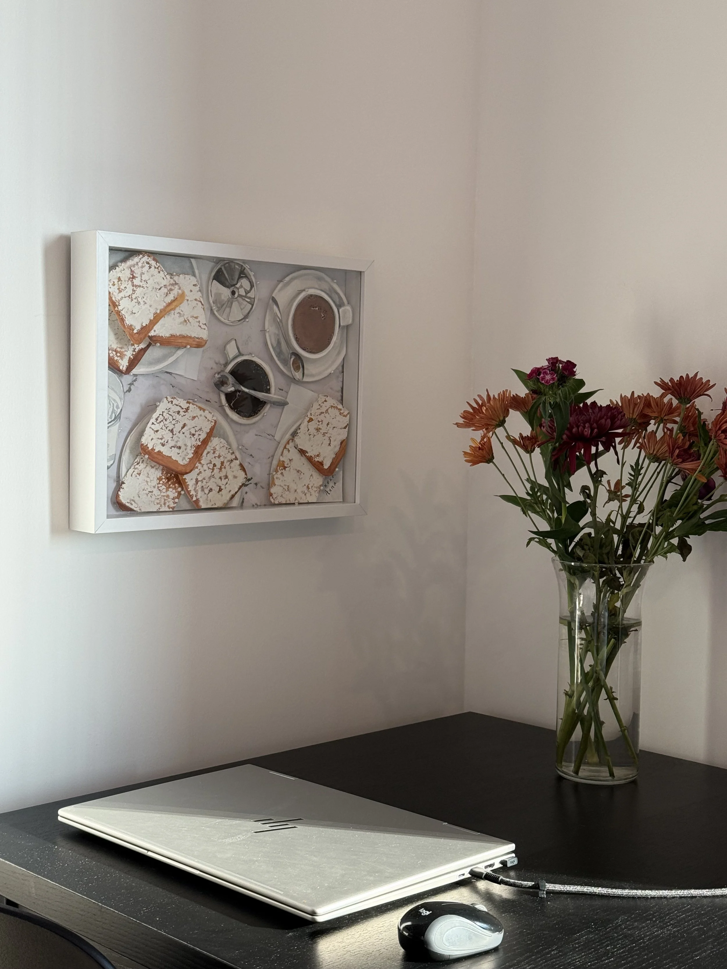 “Anna’s shadowbox pieces made me smile the second I saw them at her art show, especially the food pieces. The detail is incredible, from the tiny textures to the thoughtful layering, and it feels both playful and intentional in a way that is hard to pull off. There is so much to notice each time you look at it, which makes it feel alive and full of personality. The craftsmanship is beautiful, the colors are warm and inviting, and it adds so much charm to the space. It feels special, personal, and made with real care which is exactly what you hope for. Even better, it is the kind of art that keeps revealing itself over time and makes you feel genuinely happy to have in your home.”